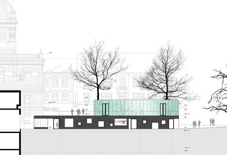 We put green amoeba into the north wedge with three slight mounds. Another small “amoeba” is proposed by the east theatre extension. We propose two lanes.The fundamental step is aggrandising (!) of the current terrace on top of the “eighties” extension. This act allows purposeful use of the lower storey for services related to the ticket office and at the same time usage of its own terrace free of useless railings and other items. We have designed a large gentle stairway to the proposed café terrace.We propose a lightweight café pavillion at the terrace in contrast to the solid „socle“ (at the height level of the current service annex). The treatment of the pavillion should be as subtle as possible to evoke a garden atmosphere.